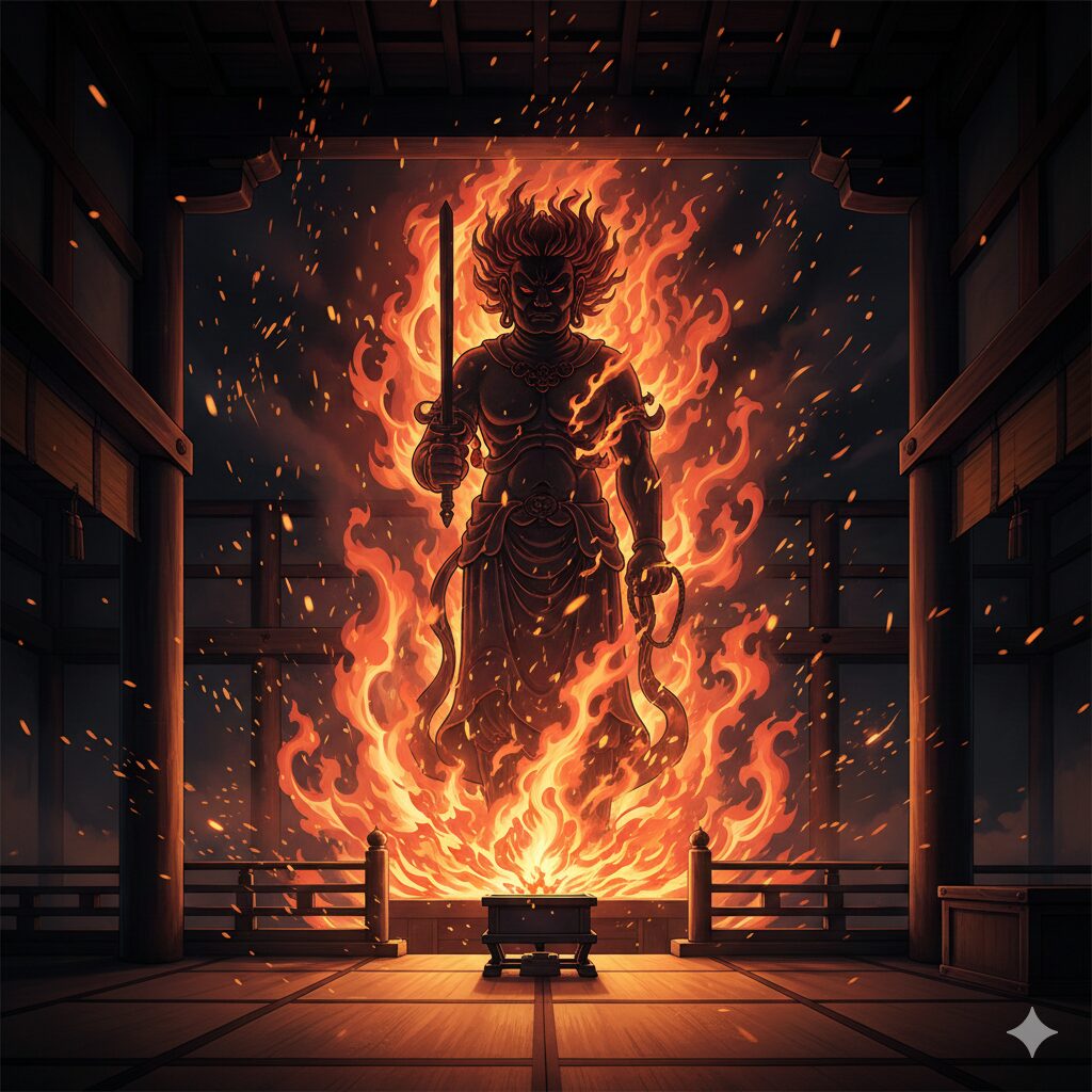 - The Fire: Represents the wisdom of Fudo Myoo, burning away all bonno (earthly desires/passions) and disasters.