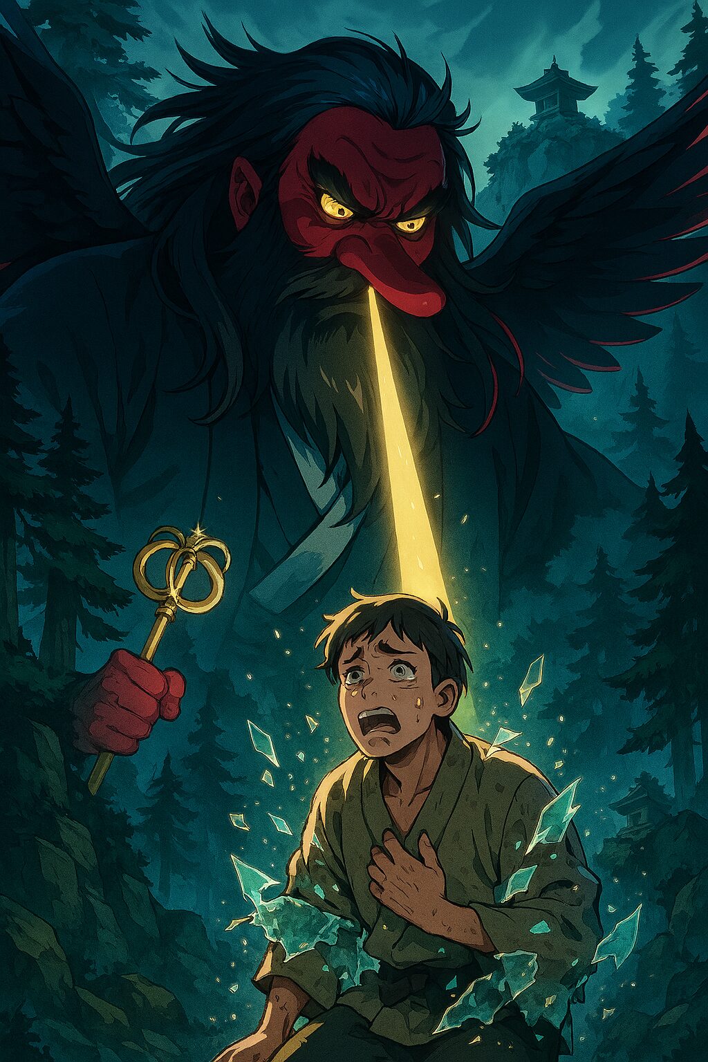 Long ago, deep in the green mountains of Japan, lived a young man named Taro. Taro was honest and kind-hearted, but a little naive about the ways of the world. His village was surrounded by mountains where the Tengu, powerful beings with supernatural abilities, were said to dwell. The Tengu are revered and sometimes feared, playing a crucial role in Japan’s mountain worship.