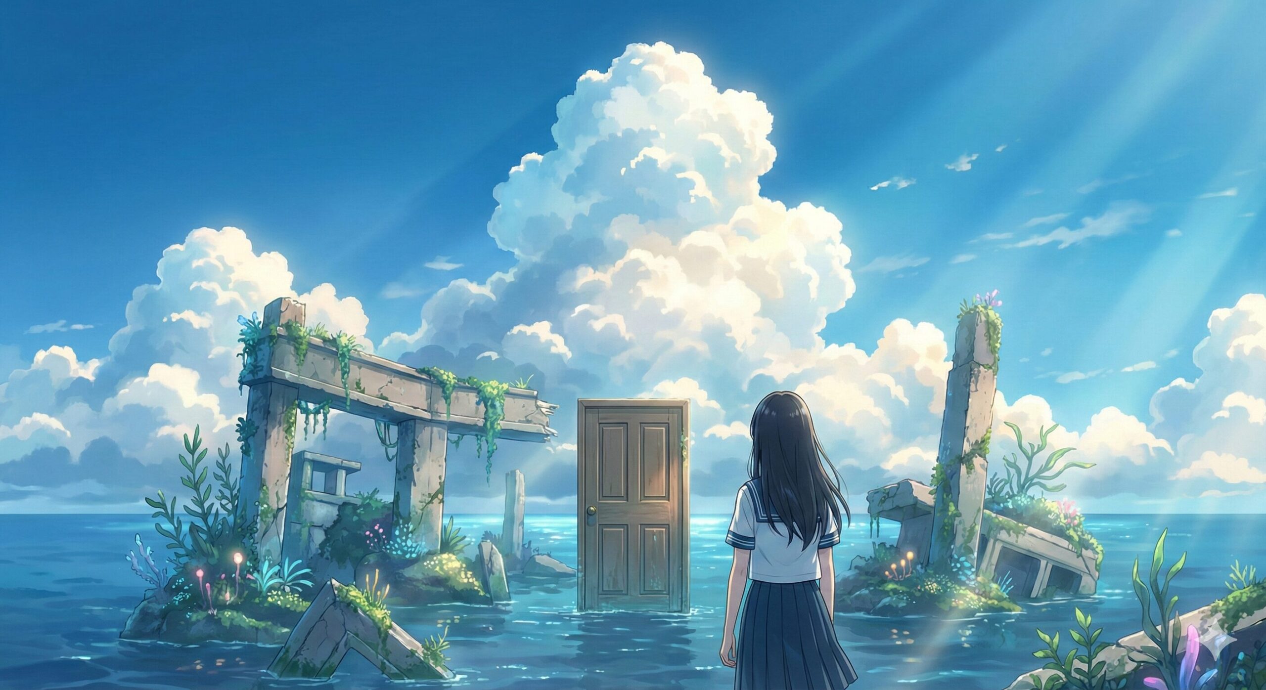 物語の主人公は、九州の静かな町で暮らす17歳の女子高生・岩戸鈴芽(すずめ)です。ある日彼女は、「扉を探している」というミステリアスな青年・宗像草太(そうた)と出会います。彼の後を追って山中の廃墟に迷い込んだすずめは、水の中にぽつんと立つ古ぼけた扉を見つけ、引き寄せられるようにその扉を開けてしまいます。しかし、その扉は日本列島の地下で蠢く巨大な災い(ミミズ)を解き放つ「後ろ戸」でした。