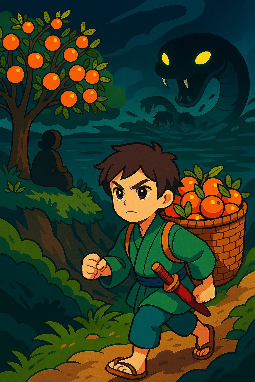 “Saburo. The monster in that swamp is terrible. Your brothers, who heeded no one’s warning, must have fallen victim to it. Listen well. Pay no mind to any strange sounds on the mountain path. And take this dagger. When you reach the swamp, take the pears only from the **south side** of the tree, so your shadow does not touch the water. If, by any chance, the monster swallows you, stab it with this dagger from inside its belly.”