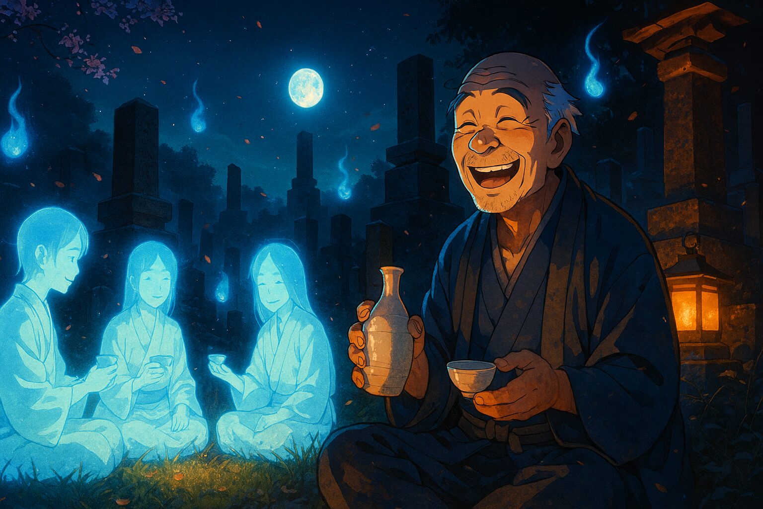 なんと、墓石の間から賑やかな話し声や手拍子が聞こえてくるのです。源さんが目を凝らすと、そこには青白い光に包まれた数人の影が車座になって座っていました。足元が透けているその姿は、どう見てもこの世の者ではありません。幽霊たちです。