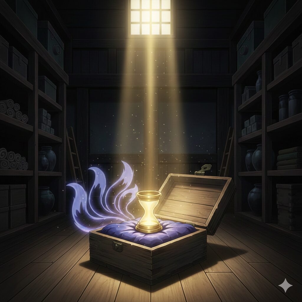 一方、分銅に化けた狐は、暗く冷たい蔵の中でじっとしていました。金属の体になっているため、身動き一つ取れません。しかも、質屋の主人は用心深く、分銅を何重もの布で巻き、桐の箱に閉じ込めていました。狐は息苦しさと孤独に耐え続けました。「甚兵衛さんが幸せになるなら」と、歯を食いしばり(分銅には歯などありませんが、魂はそう叫んでいました)、耐え忍びました。