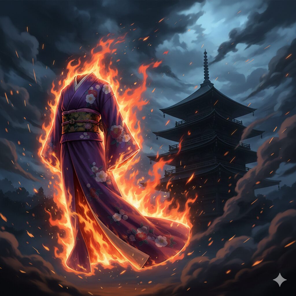 The moment the priest finished his chant and set fire to the kimono, a sudden, violent gust of wind roared through the temple grounds. The burning kimono, as if possessed by a living spirit, soared high into the sky and landed on the thatched roof of the main hall.