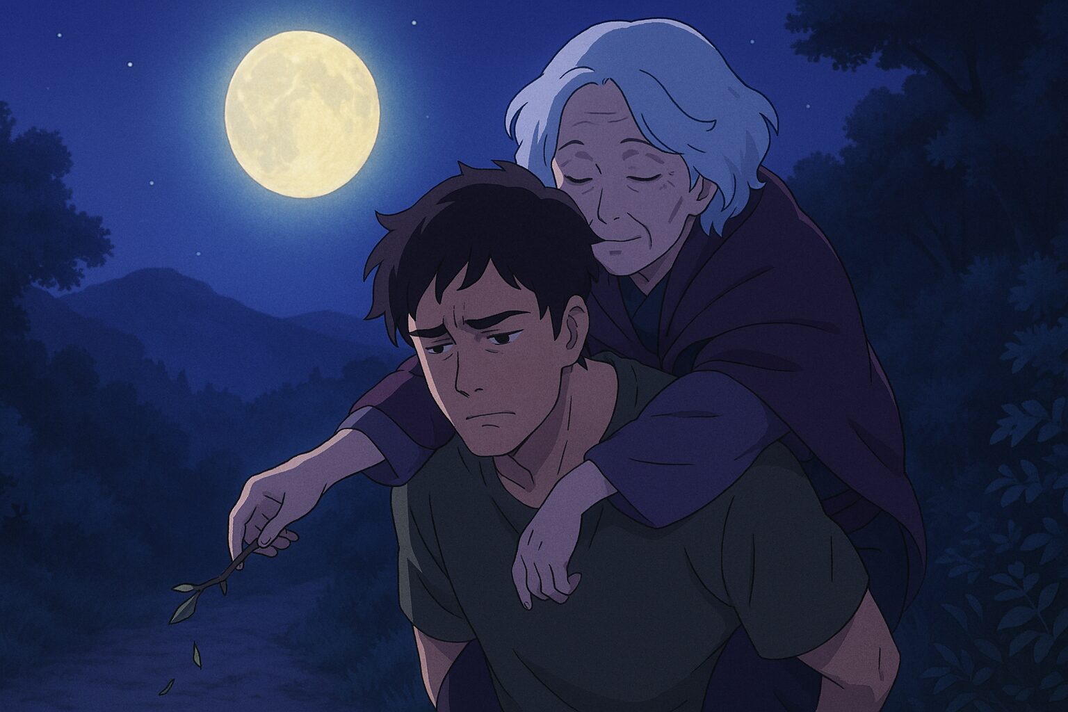 Eventually, the young man’s mother reached her sixtieth birthday. Overcome with grief, the son had no choice but to comply. With a heavy heart, he carried his mother on his back and set off for the deep, remote mountain, which was fearfully known as “Obasute Yama,” the Mountain of Abandonment.