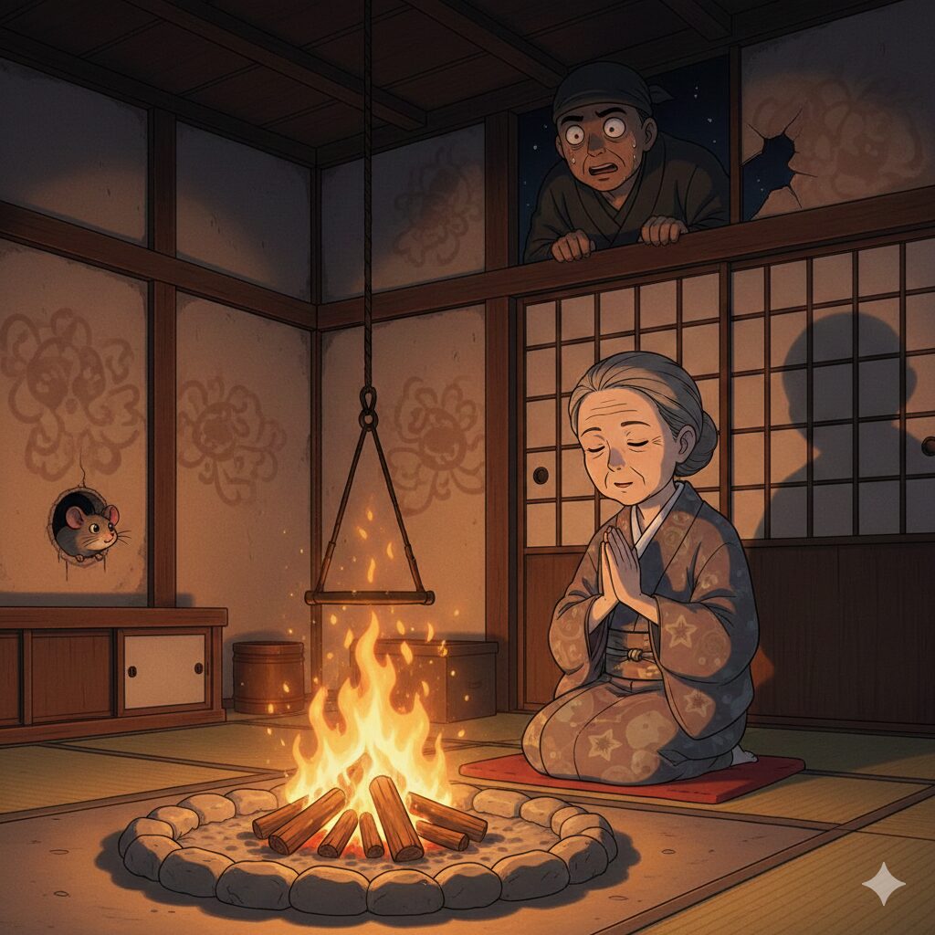 泥棒は転げるように逃げ帰り、「あの家には恐ろしい神通力の使い手がいる」と噂しました。一方、何も知らないお婆さんは、「ありがたいお経のおかげで、今日も心が安らぐ」と、ますます信仰を深めたのでした。