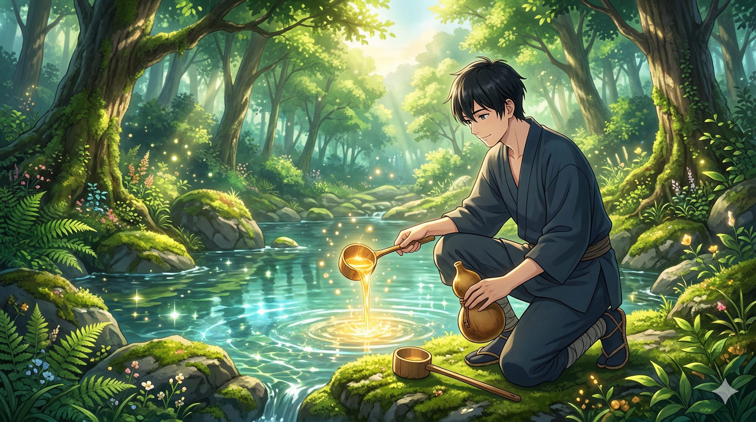 木々を掻き分けた先に、若者は信じられない光景を目にしました。苔むした大きな岩の隙間から、透き通った液体がコンコンと湧き出し、小さな池を作っていたのです。甘い香りは、間違いなくそこから放たれていました。喉が渇いていた若者は、両手でその液体をすくい、一口飲んでみました。