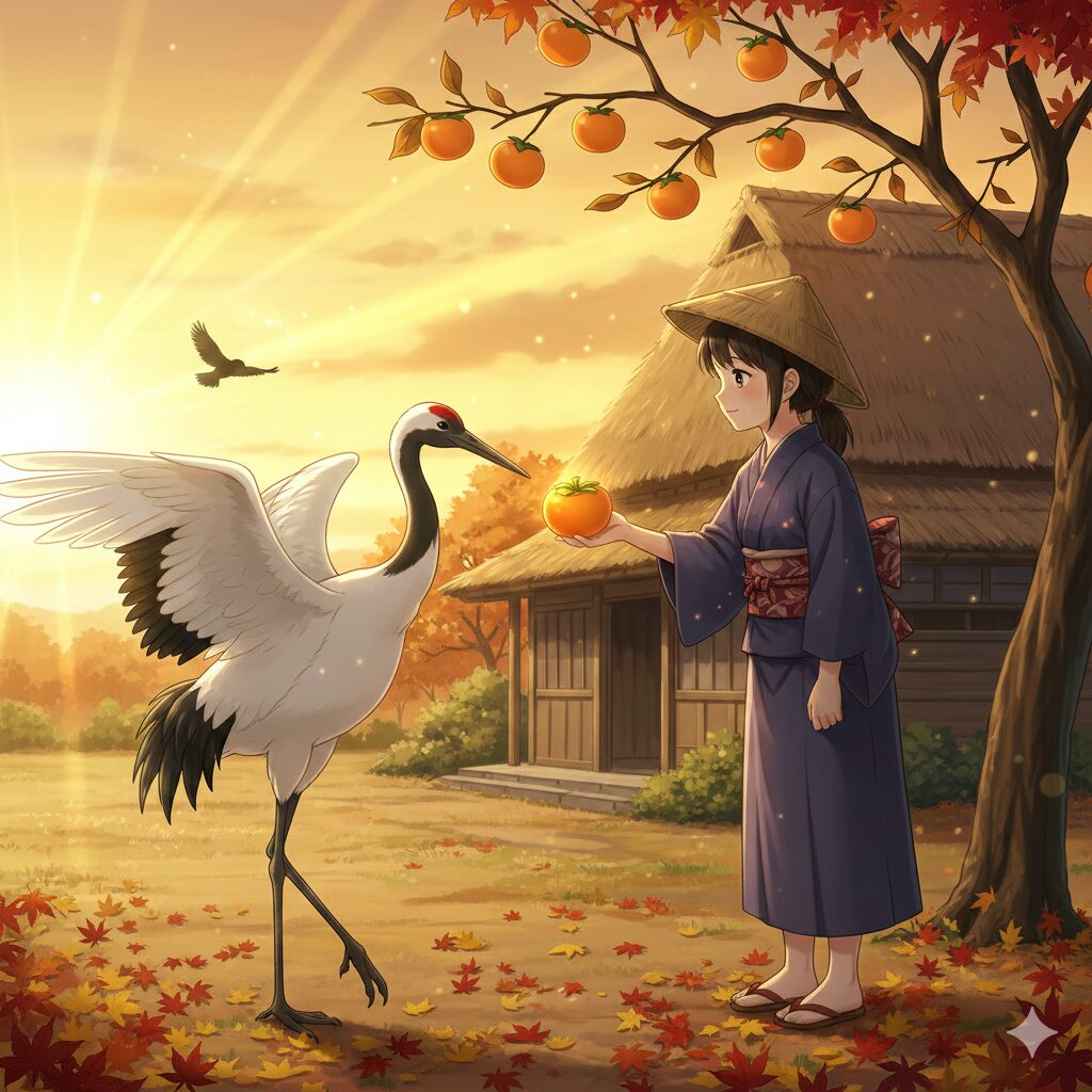 In Japanese culture, “On” is a moral concept of never forgetting kindness received and repaying it in some form. In this story, what the girl gave the crane was a “single persimmon,” but what the crane returned was “the girl’s life” and “permanent agricultural improvement (seedless persimmons).” We can see a structure of expanding happiness where a small kindness returns as a result far exceeding imagination.