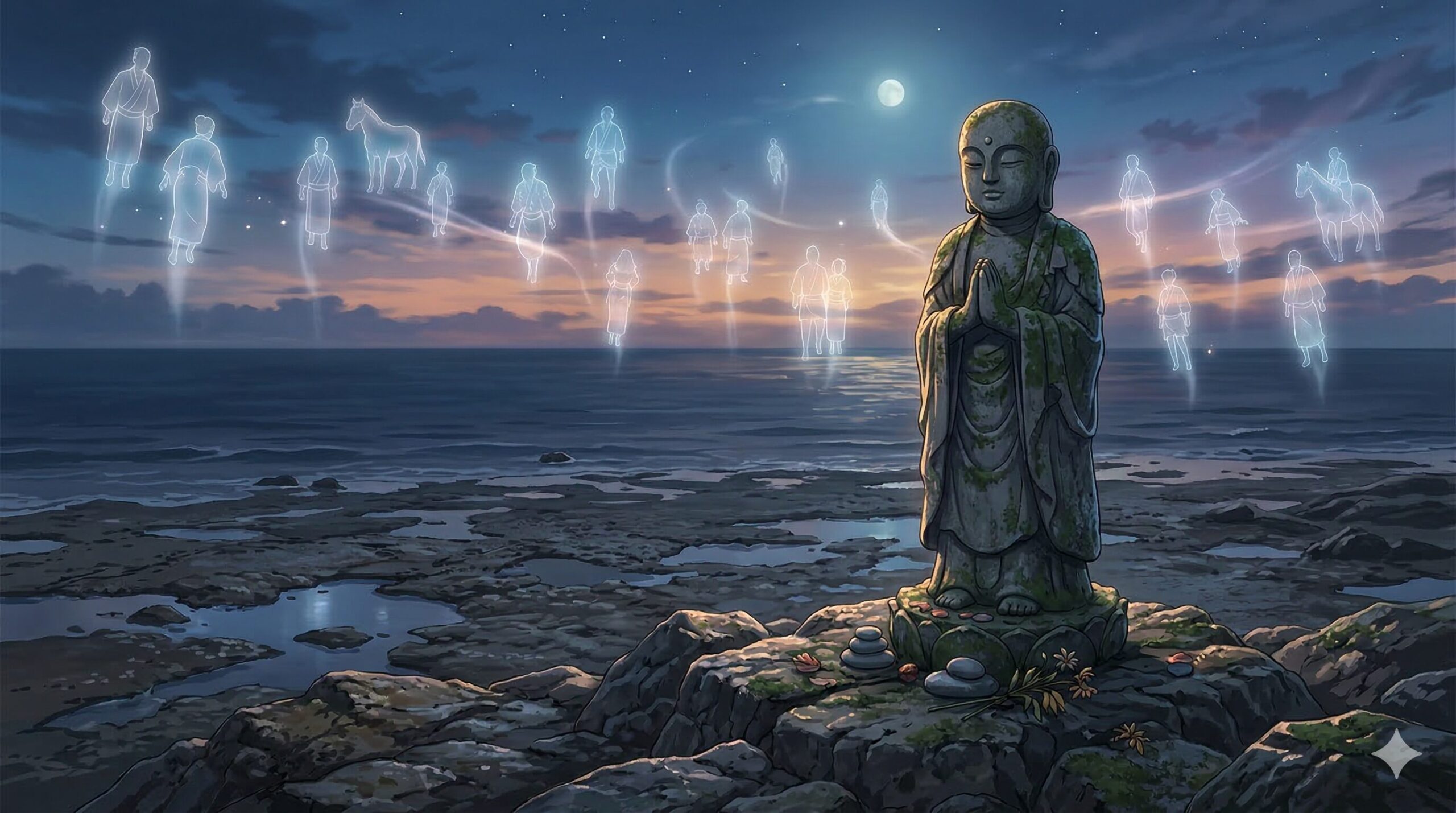 This story is not merely a ghost story. It contains a highly practical “warning” regarding natural disasters. People of the past connected the scientific fact that an abnormally receding tide is a precursor to a tsunami with the supernatural phenomenon of “souls greeting the Jizo.” This provided an excellent educational tool to ingrain the terror of disasters and the absolute necessity of evacuation into the minds of everyone, including children and those who could not read.