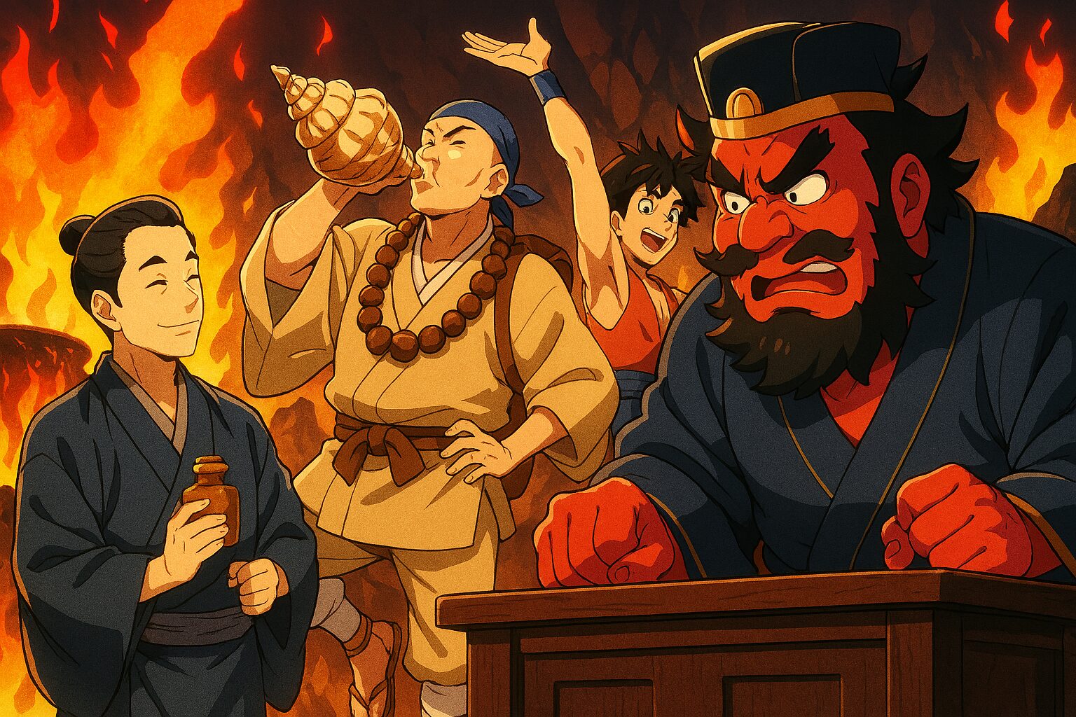 Japanese folktales often feature “Jigoku” (Hell). However, unlike the purely despairing inferno depicted by Dante in the West, Japanese Hell is sometimes portrayed as a surprisingly human, albeit bureaucratic, place. The story I will introduce today, “Jigoku no Abaremono” (The Rampage in Hell), is a masterpiece of this genre. It tells the thrilling and humorous story of men who, after falling into Hell, use their professional skills from their living days to outwit Enma Daio (the Great King of Hell). Please enjoy this tale of resilience and humor.