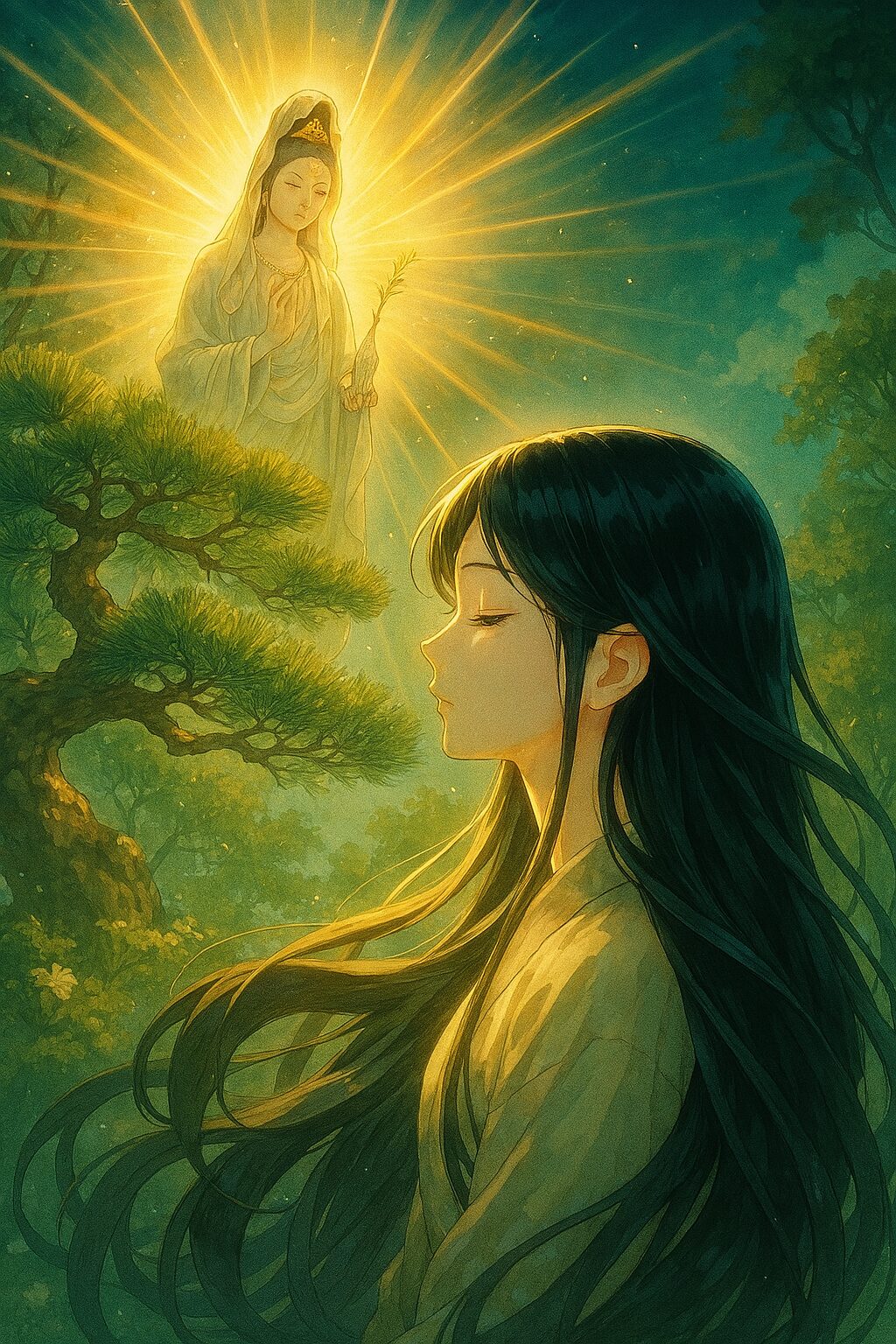 Since the Heian period, long, rich black hair has been the **undisputed symbol of feminine beauty** in Japanese court literature and aesthetics. As seen in works like *The Tale of Genji*, the value of “hair length equals dignity” was deeply established. However, this story teaches us that her success was not solely due to the beautiful hair bringing luck. Kaminagahime gained ultimate happiness because of her “filial devotion” and “spirit of cherishing things (the act of carefully hanging fallen hair on the pine)”—her inner purity and gratitude. The tale suggests that possessing not only physical beauty but also faith, filial piety, and humility is what defines the ideal female figure, and by extension, human dignity, in Japanese society.