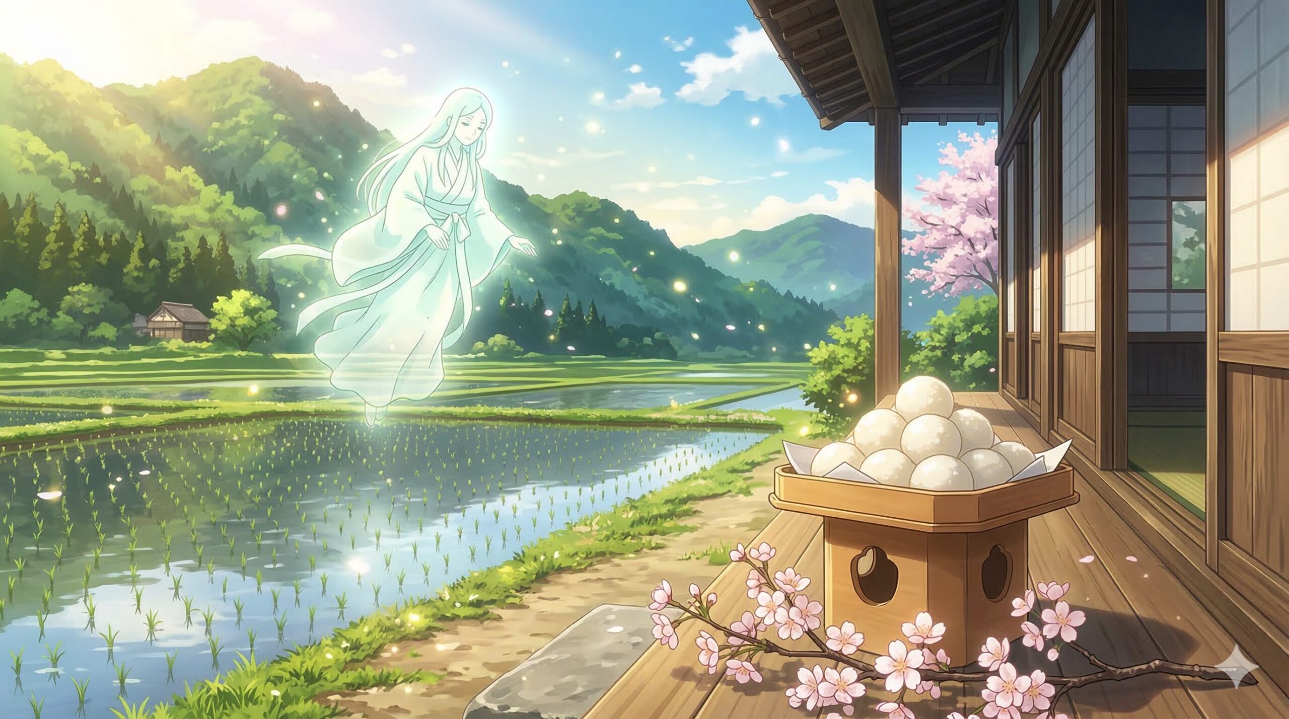 昔の日本の農民たちは、厳しい冬の間、神様は深い山奥に留まり「山の神」として自然を守っていると信じていました。そして、雪が解け、農作業の準備を始める春の3月16日、この山の神様が山を下りて里へとやってきます。里に下りた神様は、今度は「田の神(農事の神)」へと役割を変え、その年の稲作の豊作を見守り、助けてくれると考えられていました。