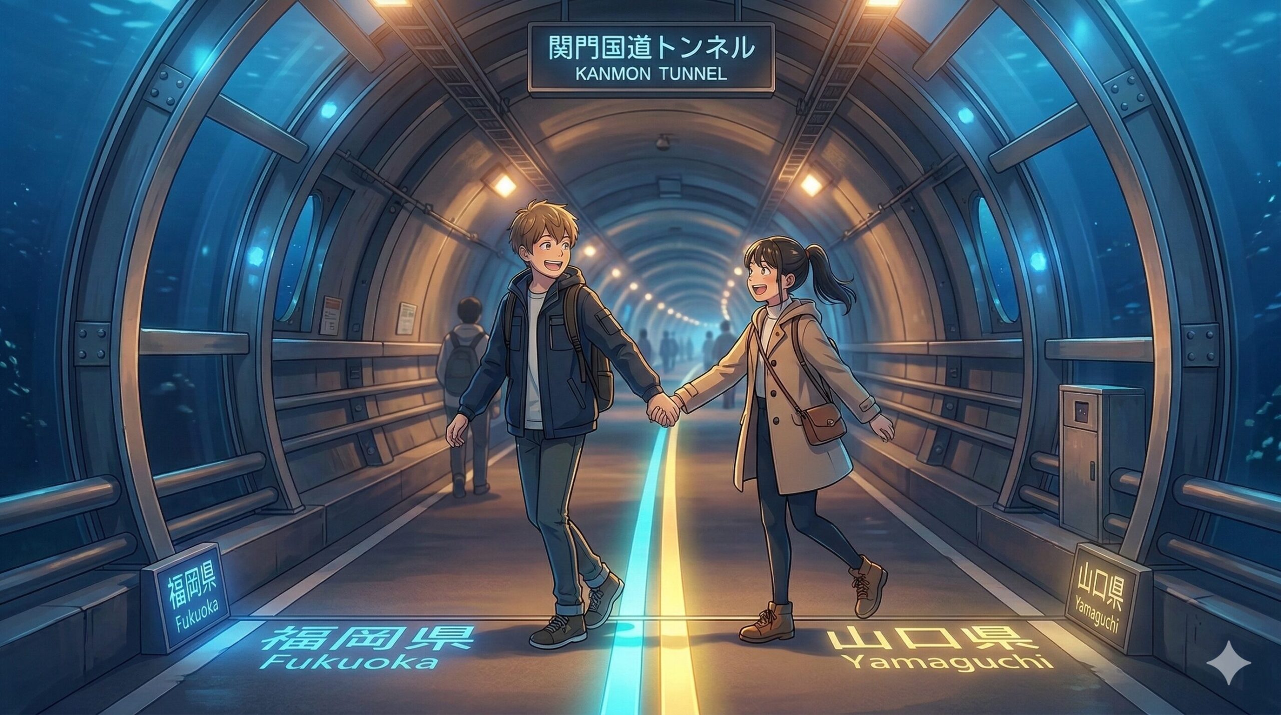 頭上を巨大な海流が流れ、巨大な船が行き交うそのはるか下を、自分の足で歩いて渡る。日常では決して味わえないこの神秘的で圧倒的な体験を、あなたはどのように感じるでしょうか?もしあなたが日本を訪れ、この関門トンネルの中央にある「県境」の上に立ったなら、右足と左足で異なる大地を踏みしめながら、どのような日本の歴史に想いを馳せるでしょうか?ぜひ、あなた自身の足でこの歴史的な海峡を越え、その感想を私たちに教えてください。
