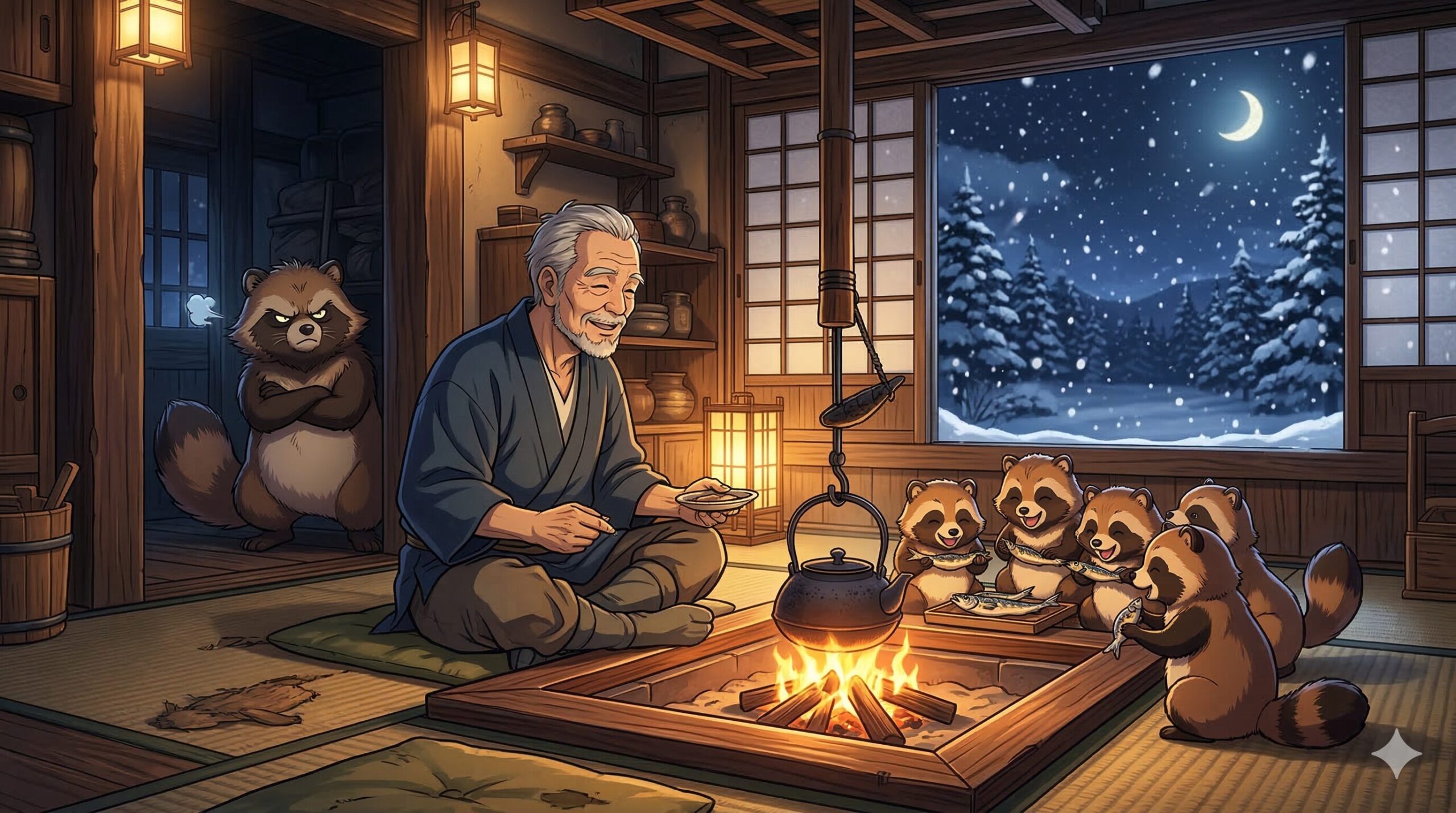 One biting cold night, with snow threatening to fall, Old Man Nihei was warming himself by the irori (traditional sunken hearth) in the center of his hut, grilling some dried sardines (mezashi) for his dinner. Suddenly, a mother Tanuki (Japanese raccoon dog) poked her head through the entrance. Behind her, several small baby Tanuki huddled together, shivering in the freezing cold.
