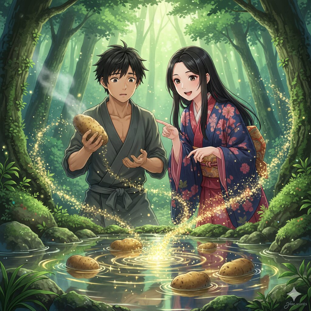 - Nature’s Bounty: Since ancient times, Japanese people have believed that gods dwell in mountains and rivers, providing blessings. The gold attached to the potatoes is a gift from nature given to an honest man who lives in harmony with the land.