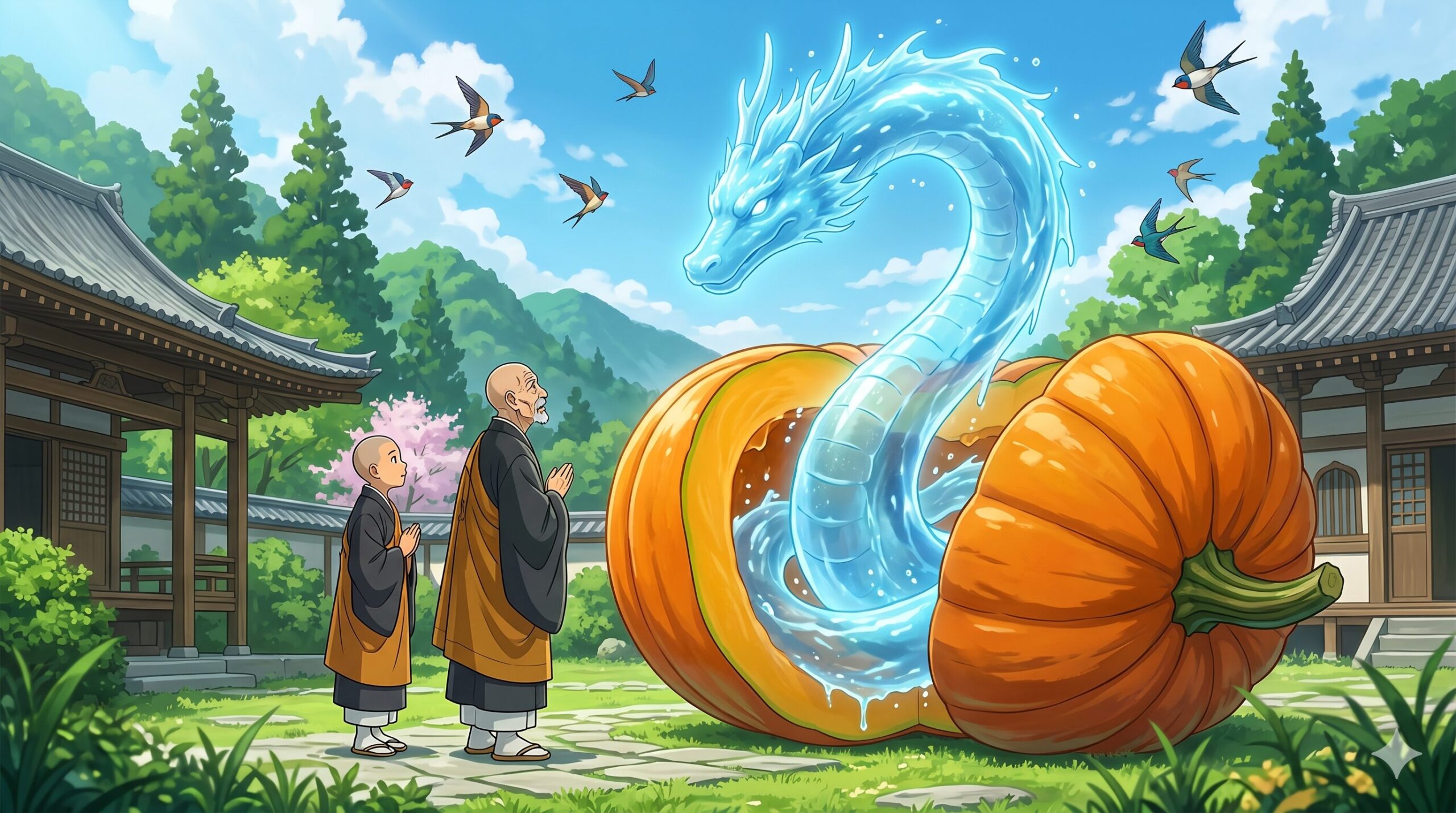 Panicking and screaming, the young monk grabbed both the snake and the pumpkin and hurled them with all his might into the small pond behind the temple. At that exact moment, the sky suddenly turned pitch black, and a violent, terrifying storm began to rage. Even as night fell, the torrential rain and howling wind showed no signs of stopping. Trembling with fear, the priest and the monk cautiously peeked at the back pond. There, thrashing amidst churning waves, were multiple giant snakes swimming wildly. The two monks did not sleep a wink; they frantically chanted sutras until dawn.