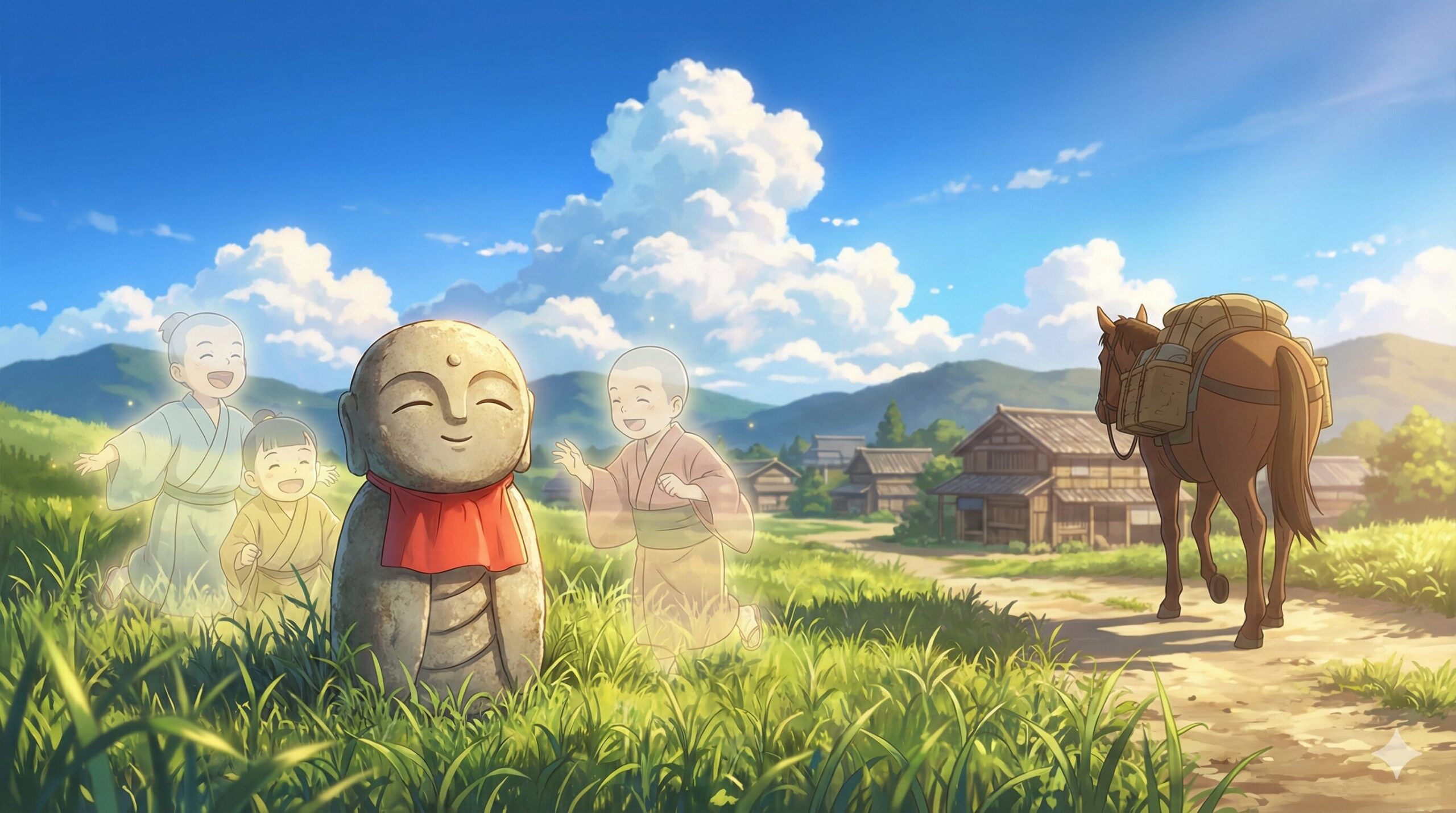 Jizo(Kshitigarbha)は、仏教の守護尊でありながら、日本では特に「子供の守り神」や「旅人の守り神」として親しまれています。五料の地蔵さんが子供たちと遊んでいたのは、まさに彼が子供を守る存在だからです。日本の田舎で見かけるお地蔵さんが、なぜいつも笑顔(あるいは穏やかな顔)なのか、この物語を読むと納得がいきますね。